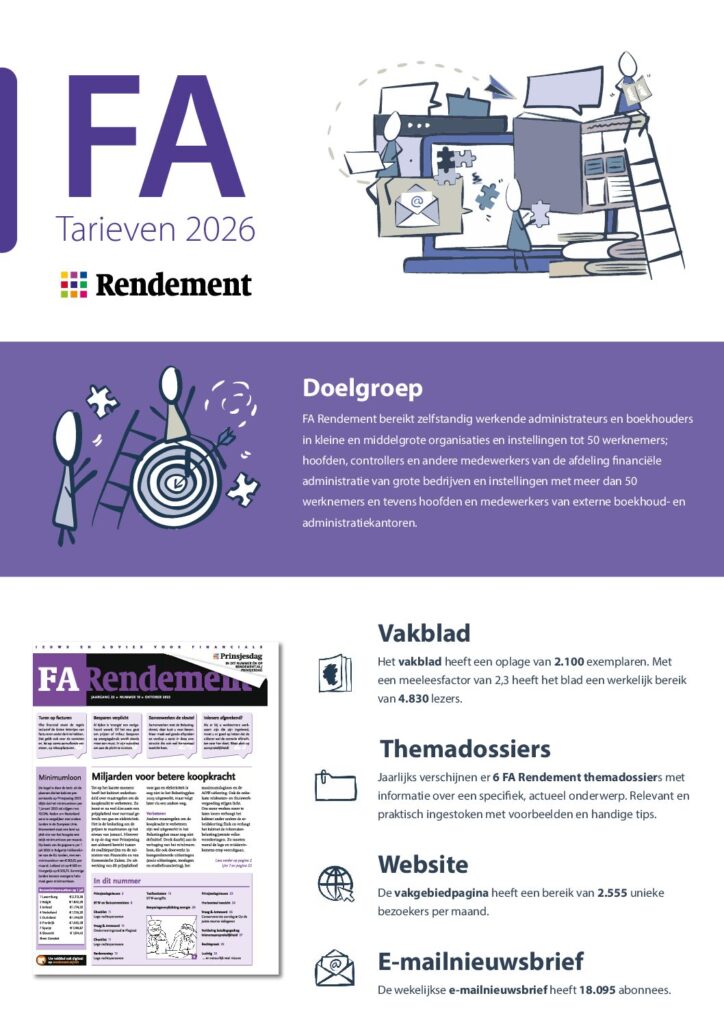 FA Rendement FA Rendement is een financieel-administratief nieuws- en adviesmagazine voor administrateurs, boekhouders, controllers, hoofden en medewerkers van de afdeling financiële administratie.